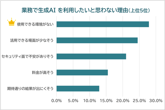 1.生成AIを利用しない理由の1位は「使用できる環境がない」生成AIを業務で利用していない回答者に理由を尋ねたところ、最も多かったのは「使用できる環境がない」(27.9%)であった。