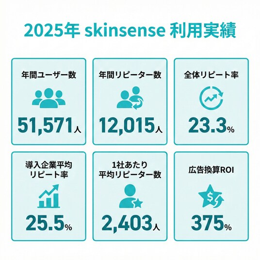 導入企業の実績を分析した結果、skinsenseを通じたリピーター(2回以上利用したユーザー)の獲得率は平均25.5%に達し、Google広告で同等のリピーターを獲得する場合と比較して約4分の1(約1/3.8)のコストで実現できていることが明らかになりました。