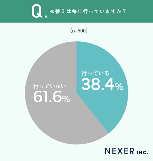 その結果、衣替えを「行っている」と回答した人は38.4%でした。一方で「行っていない」は61.6%で、衣替えをしない人のほうが多い結果となっています。