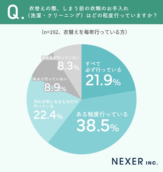その結果「ある程度行っている」が38.5%でもっとも多く、次いで「汚れが気になるものだけ行っている」が22.4%、「すべて必ず行っている」が21.9%でした。合計82.8%にのぼり、多くの人が衣替え前のお手入れを意識していることがわかります。
