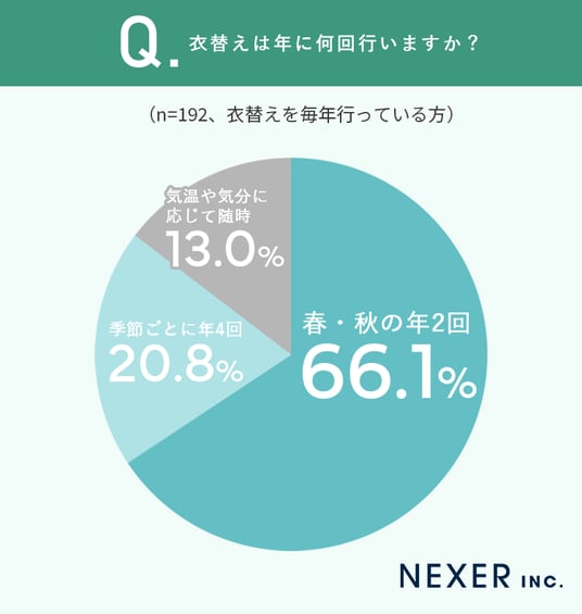 もっとも多かったのは「春・秋の年2回」で、66.1%でした。次いで「季節ごとに年4回」が20.8%、「気温や気分に応じて随時」が13.0%でした。半数以上の人が、夏と冬の入れ替えを基本のタイミングにしていることがわかります。