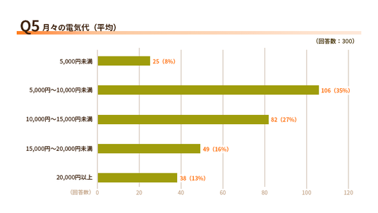 一方、「15,000円~20,000円未満」は16%、「20,000円以上」も13%と、電気代が高めの層も一定数存在します。「5,000円未満」は8%にとどまりました。