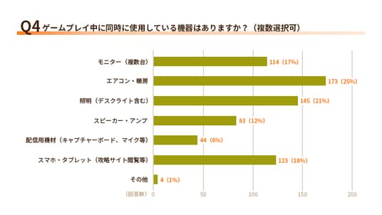 最も多かったのは「エアコン・暖房」の25%、次いで「照明(デスクライト含む)」が21%で、プレイ環境を整える家電が上位となりました。「スマホ・タブレット(攻略サイト閲覧等)」も18%と多く、情報収集目的での併用も一般的であることがわかります。