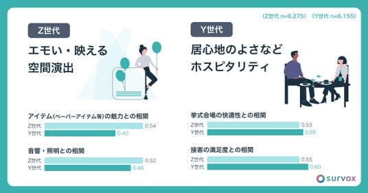 Z世代にとって、ペーパーアイテムのデザインや音響・照明による「空間演出(世界観)」は、式場を評価する上で重要な要素となっています。「エモい」「映える」といった感覚的な体験が推奨意向に影響しています。 一方、Y世代が重視するのは、スタッフの接客など「ホスピタリティの本質(居心地)」となっています。