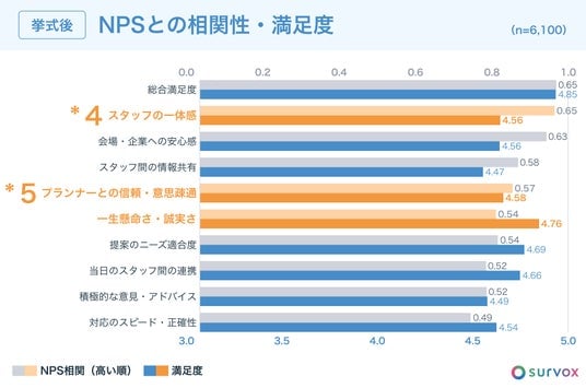 その他にNPSとの相関性が高い項目は「準備期間から結婚式当日を通じて、プランナーを信頼できており、意思疎通が図れていましたか?」「準備期間から結婚式当日を通じて、プランナーの接客や対応から、一生懸命さ・誠実さは感じられましたか?」(*5)でした。