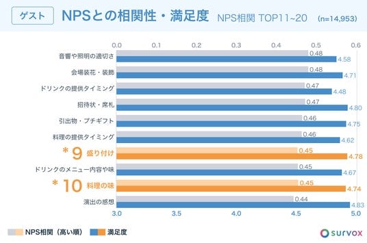 一方で、「盛り付け(相関性0.45)」(*9)や「料理の味(相関性0.45)」(*10)の相関はこれらを下回りました。料理関連の満足度平均スコアは「4.62~4.78」と全体的に高水準であるため、ウエディングにおいて「料理がおいしいことは前提条件」となっており、式場を推奨する動機付けとなるのは、当日のスタッフによるホスピタリティや細やかな気配りであることが分かります。