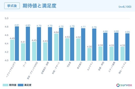 結婚式当日の体験が事前の想像を超えて感動を生んでいることが、高い満足度につながっていると考えられます。