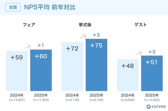 株式会社ウエディングパーク(本社:東京都港区、代表取締役社長:日紫喜 誠吾)は、ウエディング業界向け顧客インサイト可視化ツール「survox(サーヴォックス)」に蓄積されたサーベイ結果を分析し、業界初となるNPS(R)(ネット・プロモーター・スコア)の全国平均および相関分析レポートを公開いたしました。 人材不足や顧客ニーズの多様化が進む中、データドリブンな式場運営を支援するため、本調査では2025年1月1日~2025年12月31日に回答のあったブライダルフェア参加者・結婚式実施者・ゲストの膨大な声をもとに、顧客満足度やファン化の要因を分析しました。