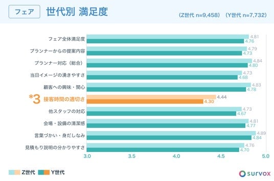 「接客時間の長さは、適切でしたか?」(*3)は、満足度が他の項目と比較して低い傾向があり、世代別の満足度では、Z世代(満足度:4.44)、Y世代(満足度:4.30)で、Y世代の方が若干、時間にシビアな傾向が見られました。
