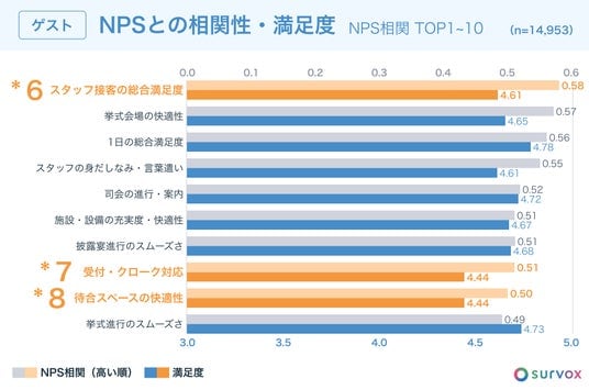 改善の余地があると思われるポイントは披露宴前の体験です。「受付やクロークでの案内(満足度4.44)」(*7)「待合スペースでの快適性(満足度4.44)」(*8)は、他の項目と比較してスコアが低い傾向にあります。 しかし、これらの項目はNPSとの相関が「0.50~0.51」となり、無視できない点であることが分かります。挙式・披露宴に注力する一方で、ゲストの第一印象を決める「お出迎え」や「待ち時間」の質を高めることが、総合評価を押し上げるヒントであることがデータから読み取れます。