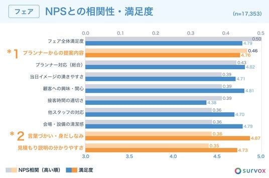 一方、「言葉づかい・身だしなみ」「見積り説明の分かりやすさ」(*2)といった基礎項目は、高い満足度ではあるものの相関性はやや低くなっています。ウエディング業界全体の接客レベルが高水準であることと同時に「基礎スキル」では差別化は難しいとも考えられます。