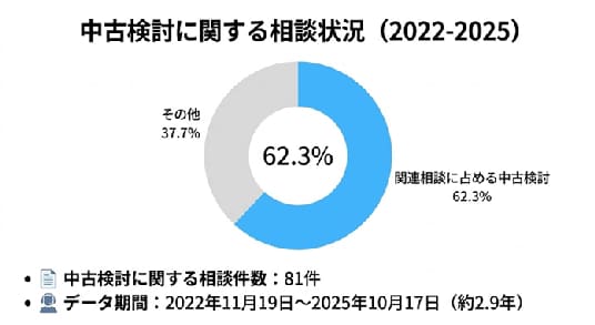 その結果、中古検討に関する相談は81件、関連相談の62.3%を占め、現場では新品比較や価格相場より先に「中古で大丈夫か」が確認されている実態が明らかになりました。