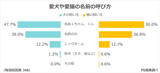 「名前+ちゃん、くん」(犬:47.7%、猫:50.0%)が最多。愛猫は“ちゃん・くん”を付ける割合が高く、愛犬は「名前のみ」(犬:39.0%、猫:36.8%)の割合がやや高い。