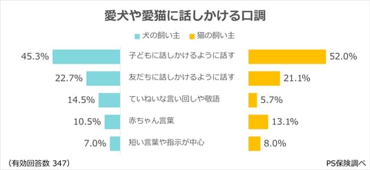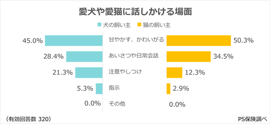 ペット保険「PS保険」を提供するペットメディカルサポート株式会社(本社:東京都港区、代表取締役社長:米満 明仁)はこの度、全国の20~69歳の犬や猫の飼い主1,635名(有効回答数347)にアンケートを実施し、「愛犬や愛猫への話しかけ方」に関する実態を調査しました。その結果を、詳しく紹介いたします。