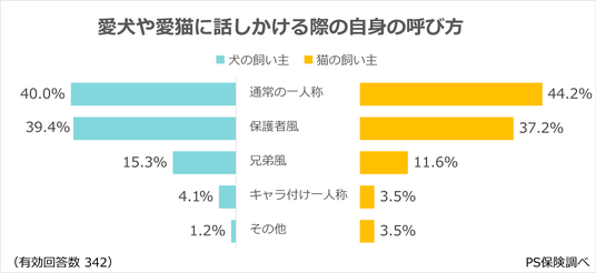 「通常の一人称(犬:40.0%、猫:44.2%)が最多。犬の飼い主は、ママやお兄ちゃんのような役割を演じる呼び方が比較的多く、猫の飼い主はその傾向が控えめ。