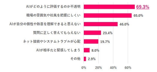 AI面接を受けたくない理由は、「AIがどのように評価するのか不透明」が69.3%で最も多く、「職場の雰囲気や社風を把握しにくい」65.0%、「AIが自分の個性や熱意を理解できると思えない」46.0%が続きました。
