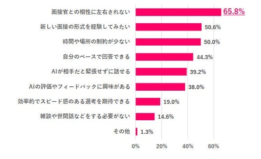 AI面接を受けてみたい理由は、「面接官との相性に左右されない」が65.8%で最も多く、次いで「新しい面接の形式を経験してみたい」50.6%、「時間や場所の制約が少ない」50.0%と続きました。