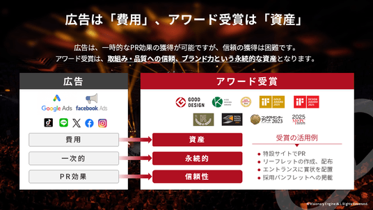 広告は短期的に認知を獲得する手段として有効ですが、出稿を止めれば効果が止まる「費用」になりやすい側面があります。一方、アワード受賞は第三者評価として企業やサービスの信頼を長期的に高める「資産」となります。