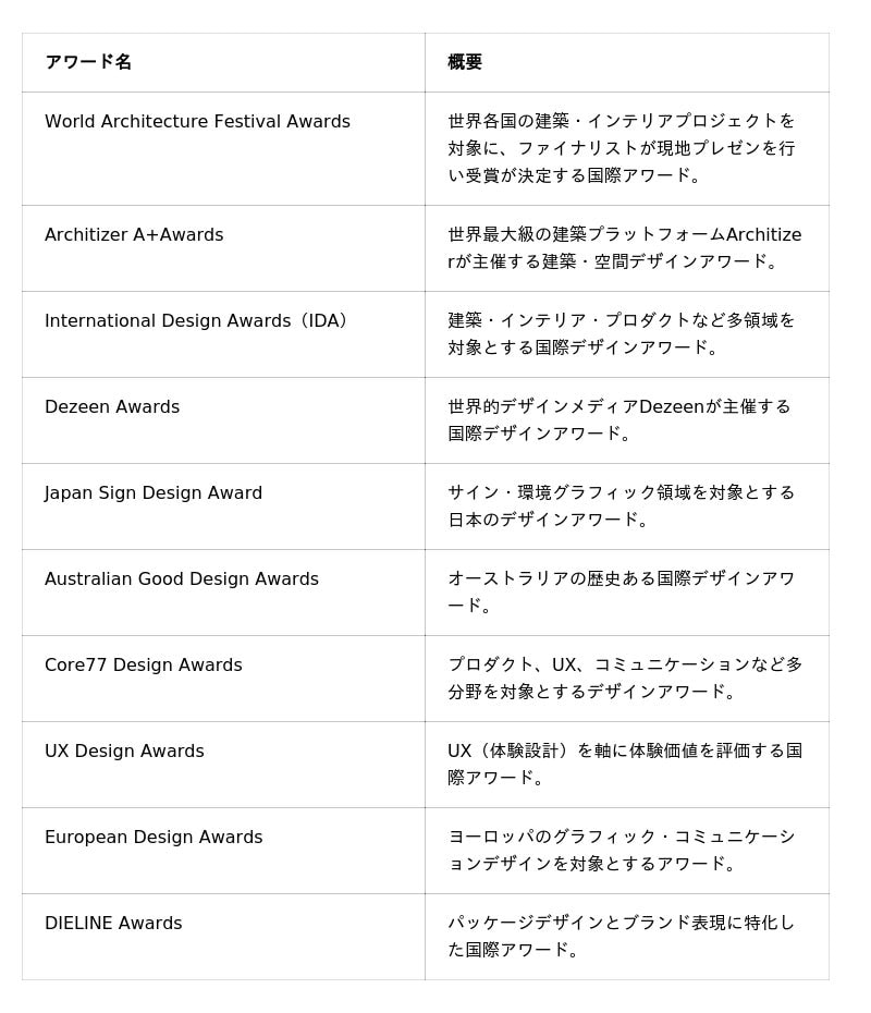 今回のアップデートでは、建築・デザイン領域を中心に世界的に注目されるアワード10件を新たに追加しています。広告が短期的な認知獲得の手段として活用される一方で、アワード受賞は第三者評価として企業やサービスの信頼を蓄積する「資産」として注目されています。