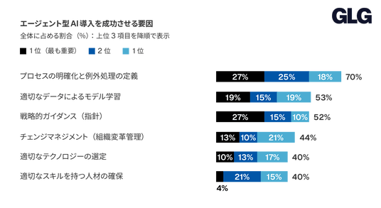 エージェント型AI導入成功の鍵は、技術選定以上にプロセスの明確化やモデル学習などの基礎固めにあると考えられていることが分かりました。