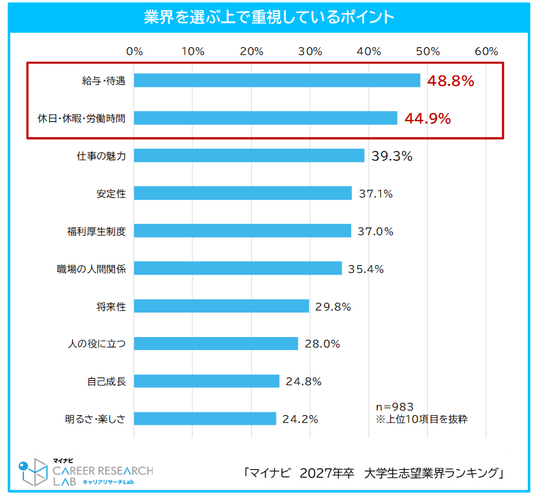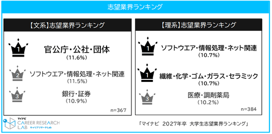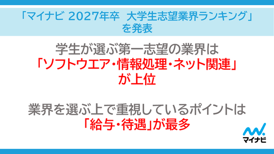 株式会社マイナビ(本社:東京都千代田区、代表取締役 社長執行役員:粟井俊介)は、2027年卒業予定の全国の大学生・大学院生を対象に実施した、「マイナビ 2027年卒 大学生志望業界ランキング」の結果を発表しました。