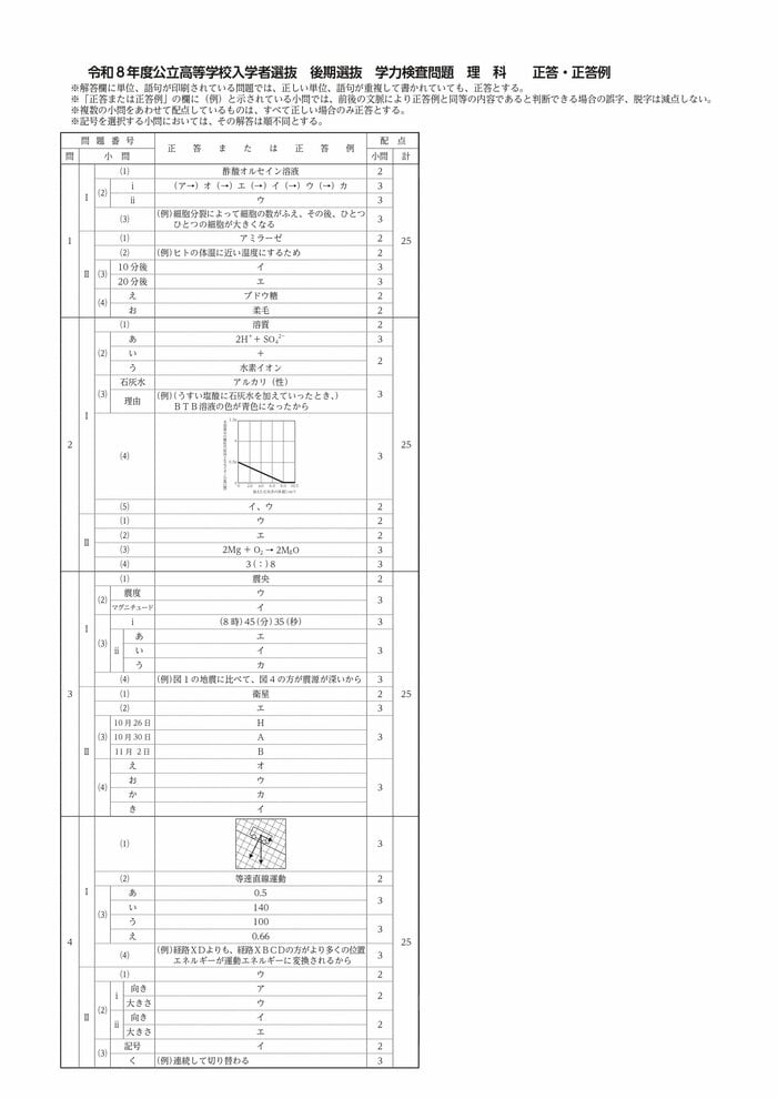 県教委による理科の正答・正答例及び評価基準は下記の通り。