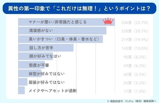 異性の第一印象で「これだけは無理!」というポイントは、「マナーが悪い/非常識だと感じる」が250票を集めて1位です。2位が「清潔感がない」で228票、3位が「臭いがきつい」で219票となりました。