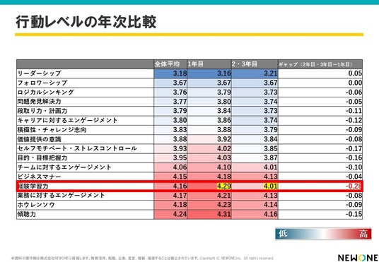 行動レベルの年次比較では、経験学習力は-0.28と、16項目の中で最も大きなスコア差が確認された。