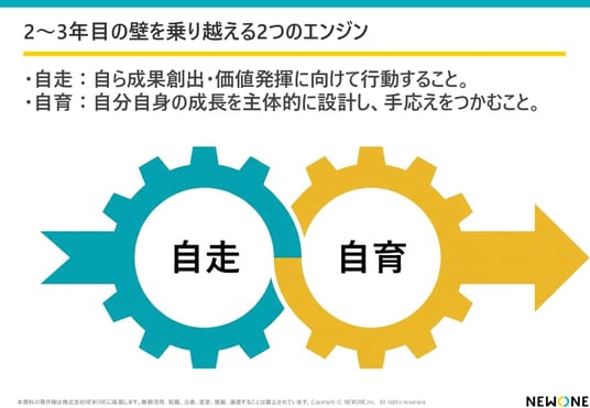 本調査から、2~3年目フェーズにおいては、役割認識や成長実感、裁量権などに年次間の傾向差が見られることが確認された。こうした傾向を踏まえると、従来の“与えられる育成”だけでなく、「自走」「自育」がポイントになることを明らかにした。