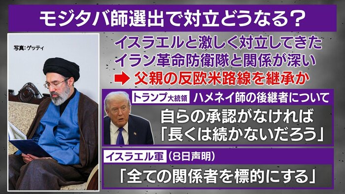 イランの最高指導者として新たに選出されたのは、空爆で死亡したハメネイ師の次男、モジタバ師(56)です。これに対し、イランへの攻撃を行っているアメリカとイスラエルは反発を強めています。