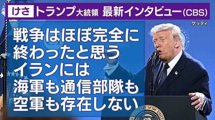 日本時間の10日朝、トランプ大統領はCBSインタビューで「戦争はほぼ完全に終わったと思う。イランには海軍も通信部隊も空軍も存在しない」と語ったことが明らかになりました。