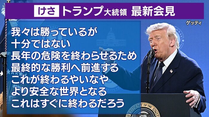 イランに対し“勝っている” “すぐ終わる”などと言葉を強めていました。さらに、イランとの戦争を「短絡的な遠出」と呼び「我々は悪を排除するためにちょっとした遠出をしたのだ」と延べ、戦争は当初から短期的であるとの考えを繰り返し強調しました。