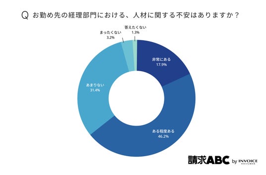 自社の経理部門における人材面での不安要素について調査したところ、多くの管理職に共通する課題であることが明らかになりました。「非常にある」(17.9%)と「ある程度ある」(46.2%)を合わせると、6割以上が何らかの不安を感じており、人材に対する課題が広く認識されている状況です。