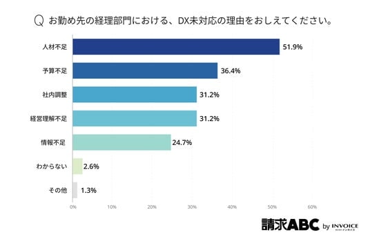自社の経理部門におけるDX未対応の理由に関する調査では、経理部門でDX・システム化が進まない最大の理由は「人材不足」(51.9%)であることが明らかになりました。DXを推進したくても、現場を担う人材に余力がなく、検討や導入まで手が回らない状況が多いと考えられます。