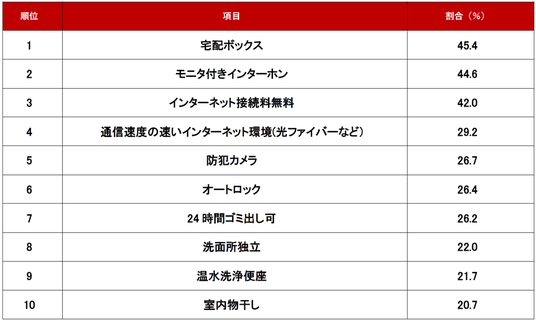 設備編の1位は「宅配ボックス」でした。不動産会社からは、「一人暮らしは不在の時間が多いため」「ネットショッピングが多く利用されているため」というコメントが見られました。