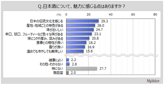 日本酒の魅力は(複数回答)、「日本の伝統文化を感じる」が29.3%、「産地・地域ごとの特色がある」が26.0%、「味がおいしい」が24.7%で続きます。