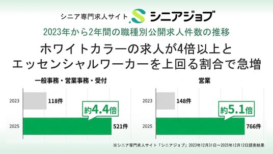 ・エッセンシャルワーカーだけでなくホワイトカラーのシニア求人も2年で4倍前後に増加
