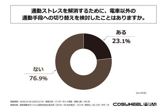 続いて、電車通勤に何らかのストレスを感じる都内在住の会社員を対象に「通勤ストレスを解消するために、電車以外の通勤手段への切り替えを検討したことはあるか」を尋ねる設問への回答では、「ない」が76.9%、「ある」が23.1%という結果になりました。この結果から、電車通勤に何らかのストレスを感じている都内在住の会社員の約4人に1人が、そのストレスを解消するために電車以外の通勤手段への切り替えを検討したことがあることがわかりました。