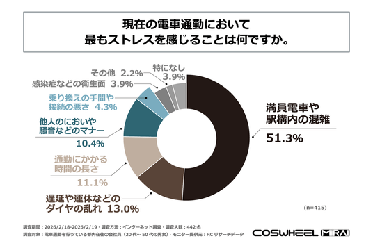 次に、現在の電車通勤に何らかのストレスを感じている都内在住の会社員を対象に「現在の電車通勤において最もストレスを感じることは何か」を尋ねる設問への回答では、1位が「満員電車や駅構内の混雑」で51.3%、2位が「遅延や運休などのダイヤの乱れ」で13.0%、3位が「通勤にかかる時間の長さ」で11.1%という結果になりました。この結果から、電車通勤に何らかのストレスを感じている都内在住の会社員が、現在の電車通勤において最もストレスを感じることは、「満員電車や駅構内の混雑」であることが明らかになりました。