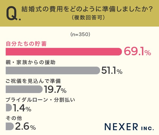 次いで「親・家族からの援助」が51.1%と半数を超えています。そのほか「ご祝儀を見込んで準備」は19.7%、「ブライダルローン・分割払い」は1.4%、「その他」は2.6%でした。
