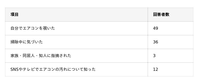 - 汚れの存在を知ったきっかけは「エアコン内部を覗いた」ことや「掃除中に気づいた」こと。