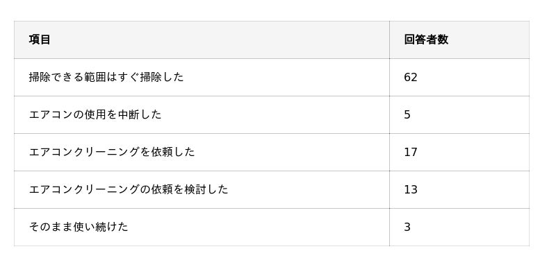 - エアコンの汚れを見て最初に感じたことは「健康への影響」で、6割ほどの人がすぐに「掃除できる範囲は掃除した」。
