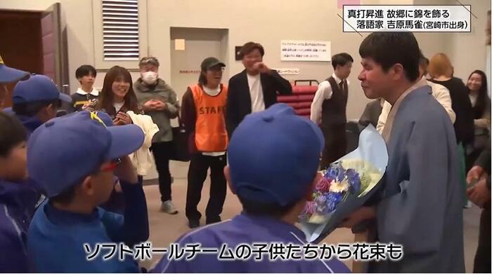 ロビーで観客に囲まれる馬雀。ソフトボールチームの子供たちからは花束も。