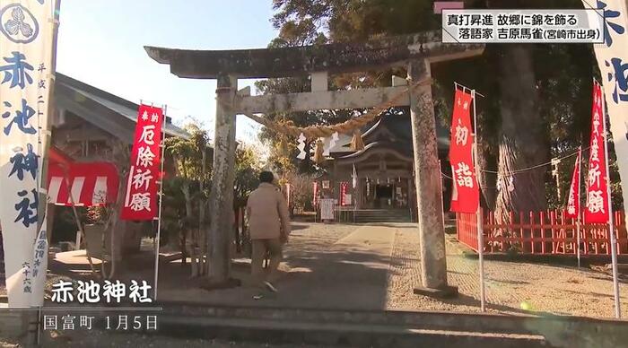 2026年1月、落語界に入門して以来、初めて年始を宮崎で過ごしたという馬雀。幼少期からゆかりのある国富町の赤池神社を訪れていた。