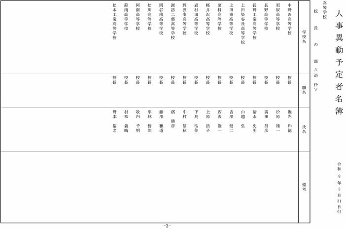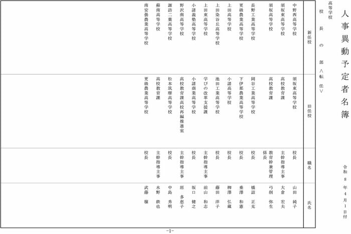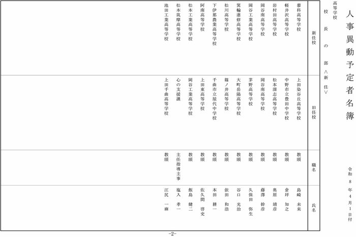 【全掲載】長野県教職員人事 県立高校の校長 異動総数41人 新任12人 女性校長の登用2人 長野放送 2026年3月10日 火曜 午後8:53 長野県教育委員会は3月10日、4月1日付け異動の県立高校の校長の人事を発表した。異動総数は41人、このうち転任は13人、新任は12人、退任は16人。新任者の平均年齢は55.3歳、女性校長の登用は2人となっている。 この記事の画像(4枚) 長野放送 長野の最新ニュース、身近な話題、災害や事故の速報などを発信します。 1 2 長野放送の他の記事 英語のリスニングでトラブルも 長野県の公立高校79校で後期選抜試験 ライフ 2026年3月10日 高校授業料の「無償化」が影響か…私立高校の志願者が増加 長野県の公立高校の倍率は0.88倍 通信制へ行く生徒も予想以上に増加 教育長「公立高校の特色化を進めたい」 ライフ 2026年3月10日 「バックカントリー滑走中に行方不明になった」オーストラリア国籍の27歳女性が遭難 スキー中に道に迷い行動不能に 午後6時過ぎに救助 けがなし 長野・山ノ内町の横手山付近 社会 2026年3月10日 【解答】長野県の公立高校入試 数学の問題と正答・正答例及び評価基準 各問の狙いは ライフ 2026年3月10日 一覧ページへ