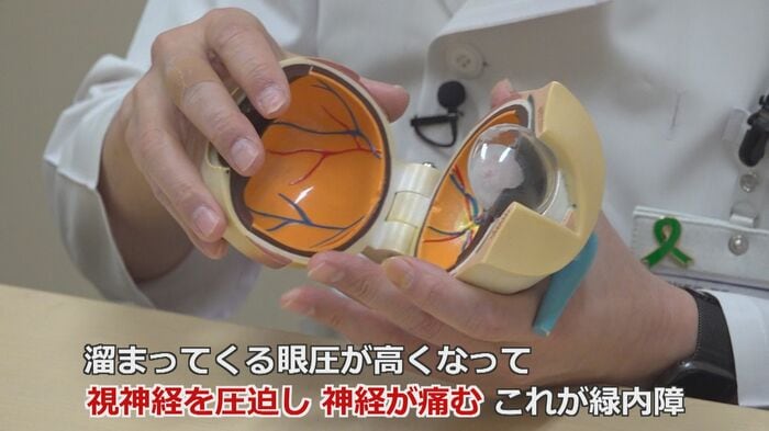「目に栄養を与える水が自然に湧いていますが、年齢とともにこの網目が目詰まりしてきます。そうすると流れが悪くなるので、中に水がたまることで眼圧が高くなって、視神経をギュッ、ギュッと圧迫して神経が傷んでくる。これが緑内障です」