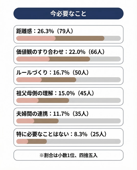 - 今必要なことは距離感26.3%(79人)、価値観のすり合わせ22.0%(66人)、ルールづくり16.7%(50人)