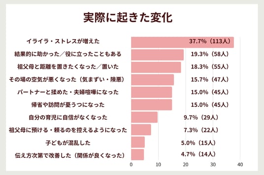 実際に起きた変化では、「イライラ・ストレスが増えた」が最も多く挙げられる一方、「結果的に助かった」と感じている人も存在し、祖父母の関与が一概に良い・悪いと分かれるものではないことが分かります。