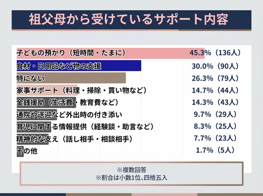 祖父母から受けているサポート内容について聞いたところ(複数回答)、実務的な支援が中心となっている実態が明らかになりました。
