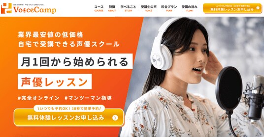 Voice Camp(ボイスキャンプ)は、オンラインで学べる声優スクールとして、声優レッスンや話し方レッスン、ナレーションレッスンなど、声に関するさまざまな学習機会を提供しています。未経験からでも声の基礎を学べるオンラインレッスンを通じて、声優を目指す方や声を活かした活動に挑戦したい方をサポートしています。